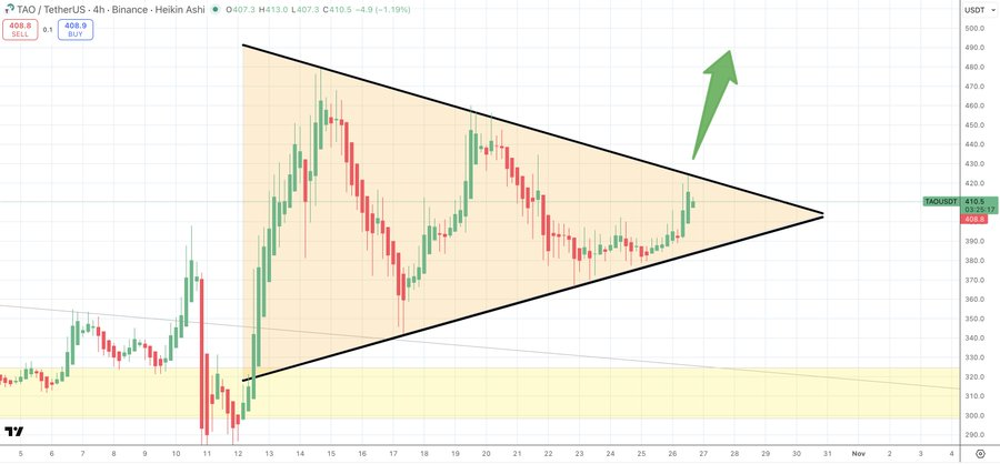 Crypto analyst Satoshi Flipper highlighted that TAO’s present market construction is one thing that might solely occur in a buying and selling textbook, calling it “an ideal pennant sample that appears prepared for a serious breakout.” Such market constructions are indicative {that a} sturdy market motion is impending.