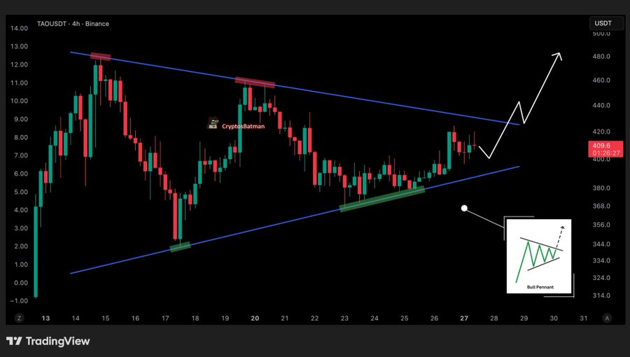 Including to the bullish sentiment, one other analyst, BATMAN, additionally shared related sentiments, stating that TAO is making a “clear and powerful bullish pennant” sample on the charts. One of these chart sample is often detected when a coin decides to consolidate earlier than its upward motion.