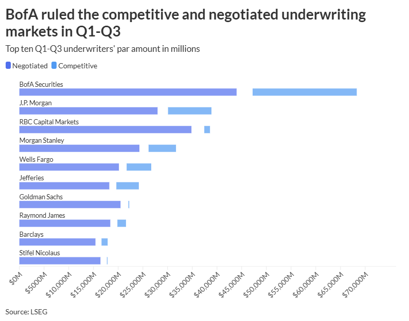 BofA Securities was the highest underwriter for Q1-Q3 by a large margin for each negotiated and aggressive underwriting.