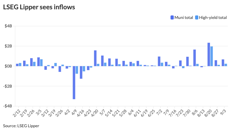 Traders added $672.3 million to municipal bond mutual funds within the week ended Wednesday, following $590.4 million of inflows the prior week, based on LSEG Lipper information.