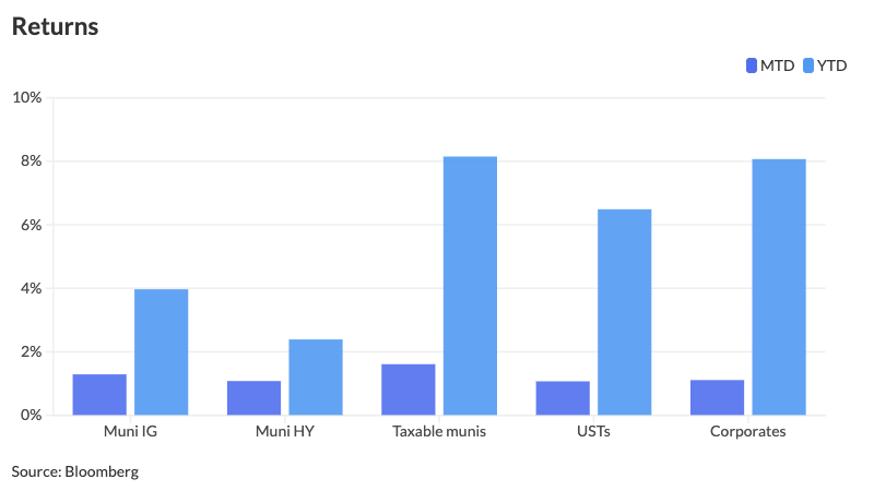 Elsewhere, in comparison with historic efficiency in October, tax-exempts have generated stable numbers this month, with investment-grade munis returning 1.29% and the high-yield munis seeing beneficial properties of 1.08%, they mentioned.
