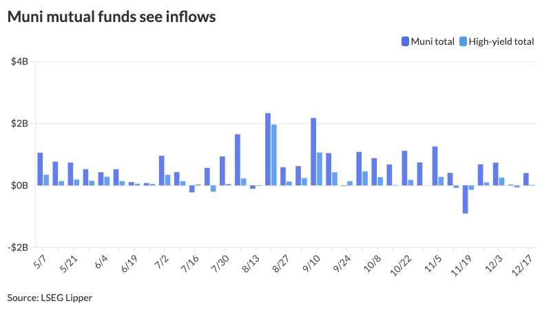 Traders added $400.1 million to municipal bond mutual funds within the week ended Wednesday, following $26 million of inflows the prior week, based on LSEG Lipper information.