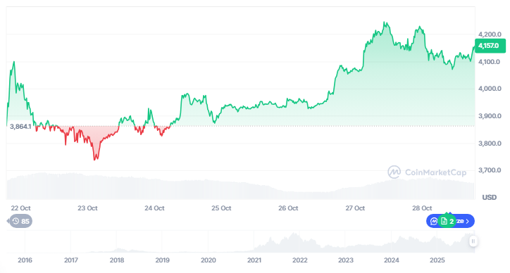On the time of writing, ETH is buying and selling at $4,157.34, reflecting regular market exercise. Its 24-hour buying and selling quantity stands at $32.11 billion, marking a 15.34% decline. Regardless of the lowered quantity, ETH maintains a robust market capitalization of $499.61 billion, underscoring its continued dominance within the crypto market.
