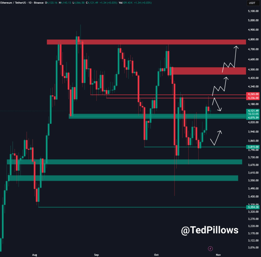 Furthermore, the crypto analyst, TED, highlighted that the day by day chart of Ethereum illustrates that it has been ranging inside robust help and resistance ranges after an upward motion. For the time being, it’s round $4,100 and faces robust resistance at $4,265. If it succeeds in remaining above $4,000, it might check larger ranges. In any other case, it might be appropriate.