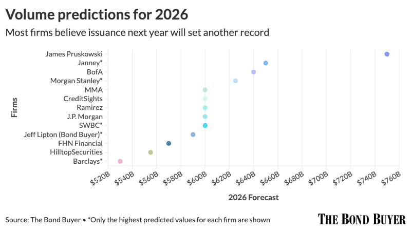 Municipal bond provide projections for subsequent yr vary from a excessive of $750-plus billion to a low of $520 billion, with most corporations anticipating issuance subsequent yr to be not less than $600 billion, simply surpassing 2025’s file.
