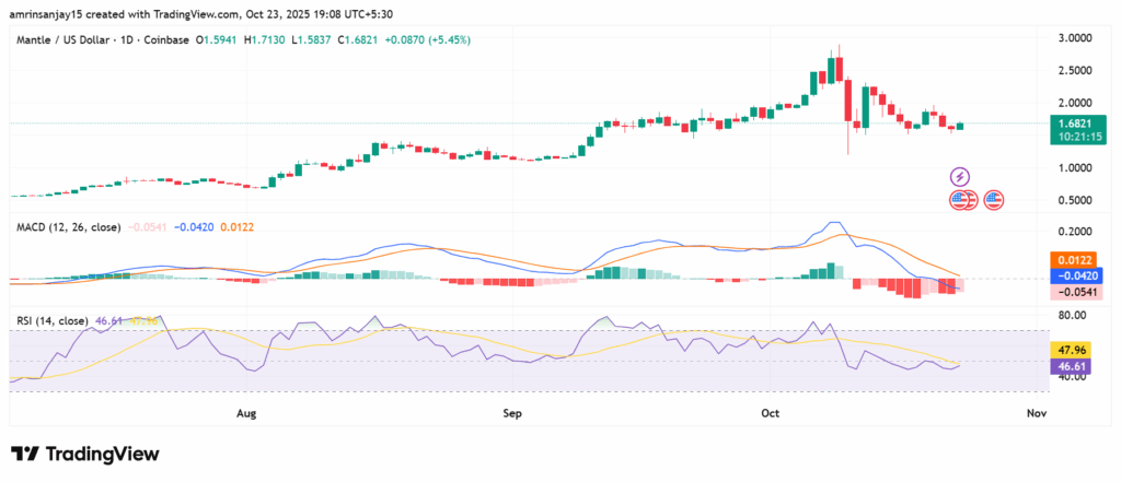 Based on Coincodex’s present worth prediction for the altcoin, the worth is predicted to drop by 24.73% and attain $ 1.26 by November 22, 2025. Primarily based on the MNT forecast, it’s now a nasty time to purchase the altcoin.