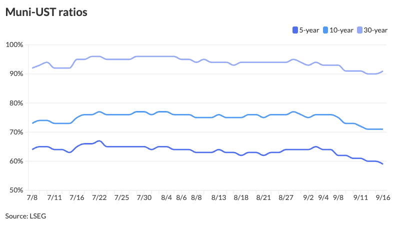 The 2-year muni-UST ratio Tuesday was at 57%, the five-year at 59%, the 10-year at 71% and the 30-year at 91%, based on Municipal Market Information’s 3 p.m. ET learn. ICE Information Companies had the two-year at 56%, the five-year at 58%, the 10-year at 70% and the 30-year at 91% at a 4 p.m. learn.
