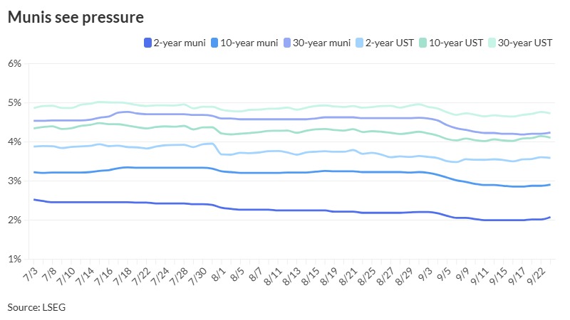 The S&P International Market Intelligence municipal curve was minimize: The one-year was at 2.16% (+5) in 2025 and a couple of.06% (+5) in 2026. The five-year was at 2.19% (+3), the 10-year was at 2.91% (+2) and the 30-year yield was at 4.25% (+3) at 4 p.m.