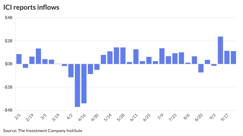The Funding Firm Institute Wednesday reported inflows of $1.114 billion for the week ending Sept. 24, following $1.138 billion of inflows the earlier week. That is the third consecutive week that inflows topped $1 billion.