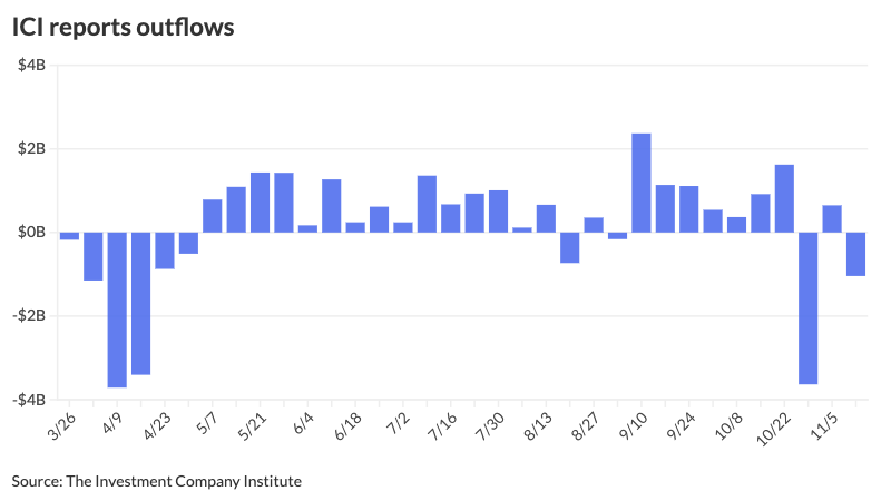 The Funding Firm Institute Wednesday reported outflows of $1.042 billion for the week ending Nov. 12, following $650 million of inflows the earlier week. This differs from the $405.3 million of inflows into muni mutual funds, as reported by LSEG Lipper, over the identical time interval.