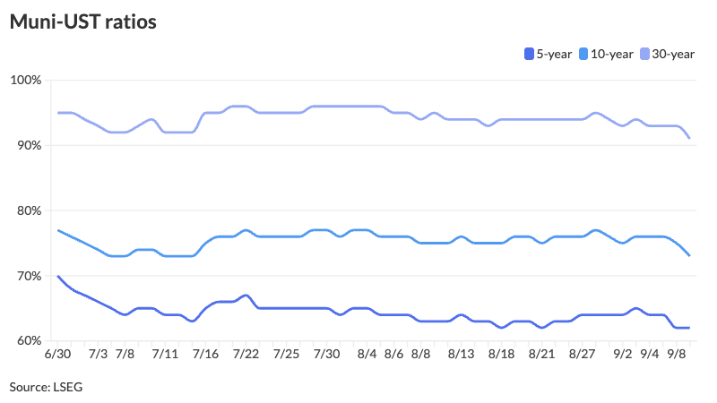 The 2-year muni-UST ratio Tuesday was at 58%, the five-year at 62%, the 10-year at 73% and the 30-year at 91%, based on Municipal Market Knowledge’s 3 p.m. ET learn. ICE Knowledge Companies had the two-year at 59%, the five-year at 62%, the 10-year at 73% and the 30-year at 93% at a 4 p.m. learn.