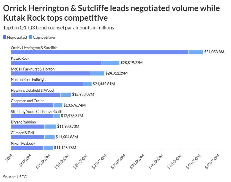 Orrick Herrington & Sutcliffe had the most important market share for prime bond counsels over the previous a number of quarters, whereas Kutak Rock and McCall Parkhurst & Horton battled for second.