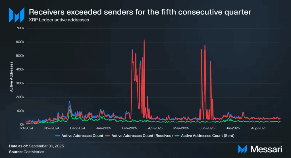 - XRP closed Q3 2025 at an all-time excessive of $2.85 with a market cap of $170.3 billion.